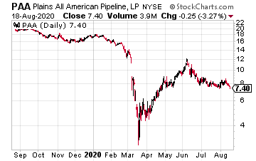 Also, in April, crude oil pipeline company Plains All American Pipelines LP (PAA) reduced distributions by 50%, down to $0.18 per share. For the 2020 second quarter, Plains reported distributable cash flow (DCF) of $0.41 per share, down from $0.73 for the 2019 second quarter.