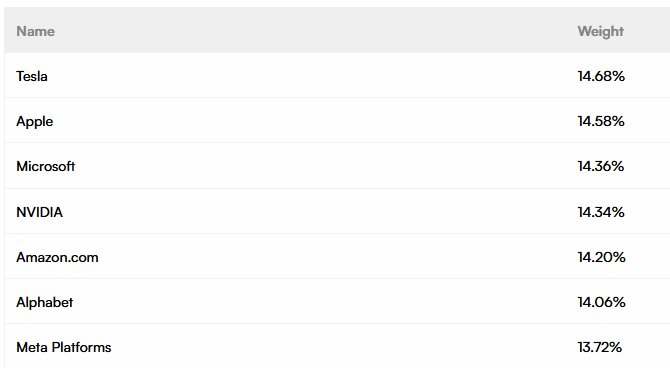Roundhill Investments has established the Roundhill Magnificent Seven ETF (MAGS). It owns the seven stocks with an equal weight. Here are its holdings: