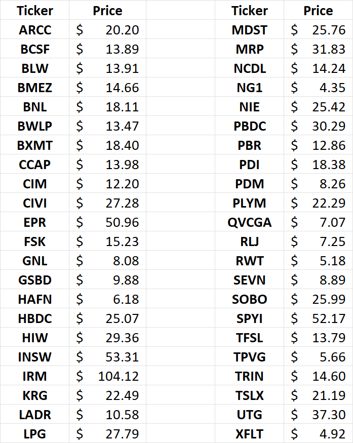 Here is my Dividend Hunter watch list. These are stocks I follow for a variety of reasons. They are NOT recommended investments. As I updated the prices it was very obvious that high-yield stocks, especially BDCs have declined significantly over the last month. I think the sell-off is unwarranted and most of these companies and the BDCs we own will be fine.