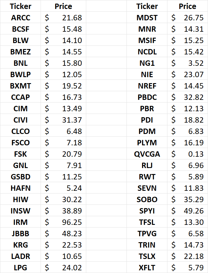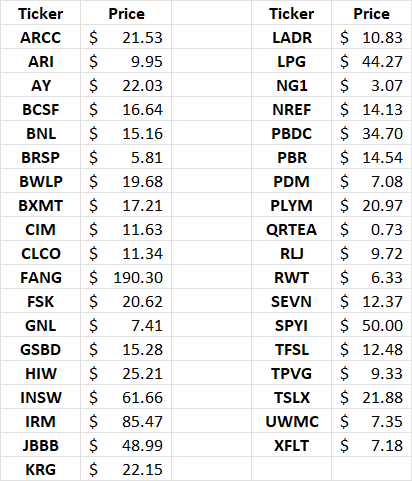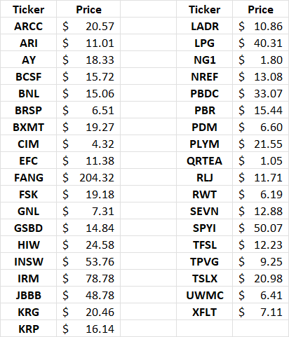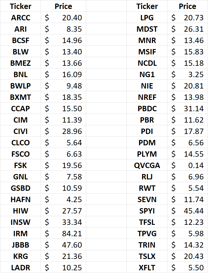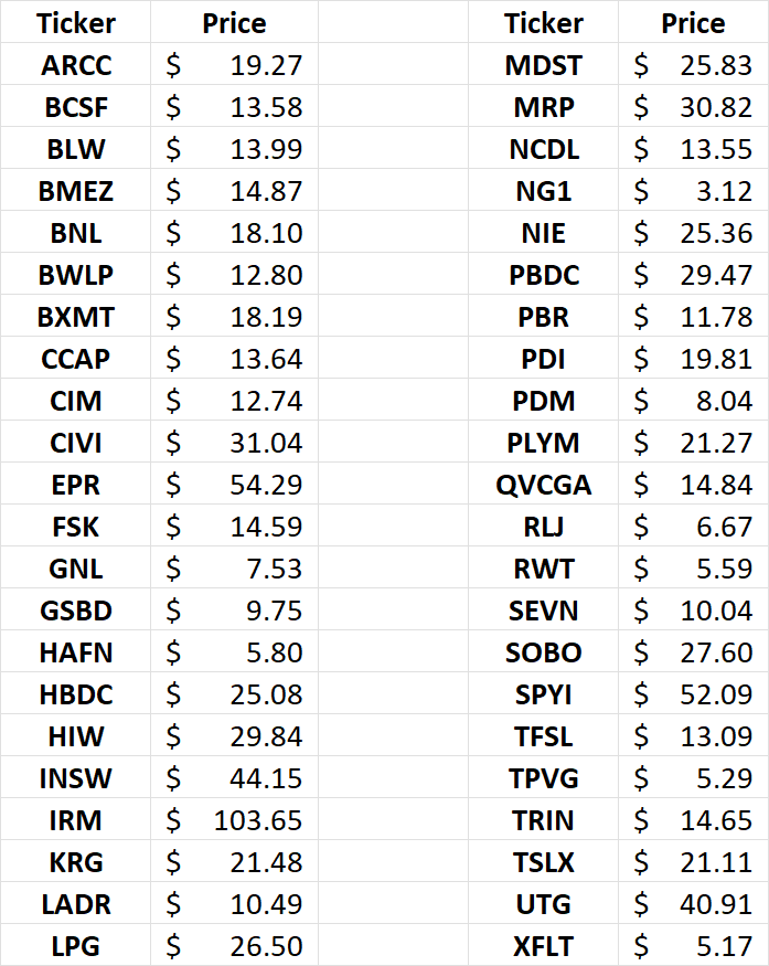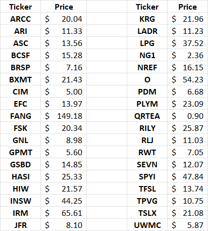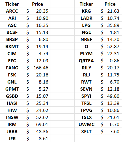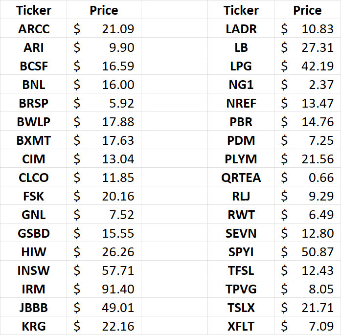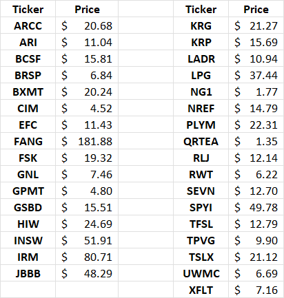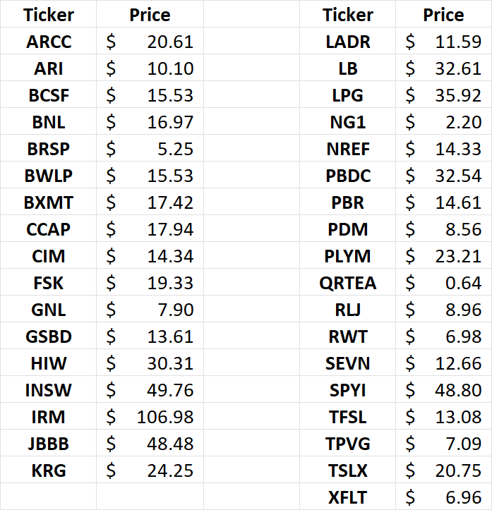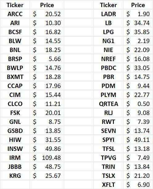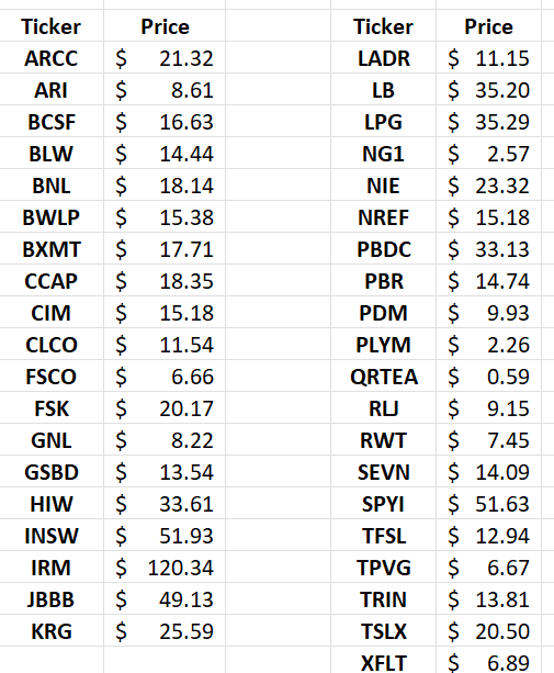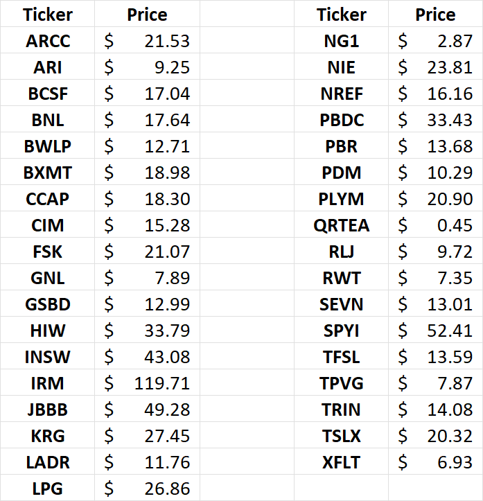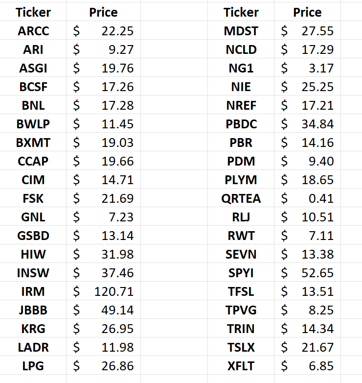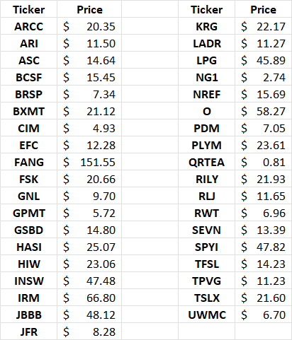 Here is my Dividend Hunter watch list. These are stocks I follow for a variety of reasons. They are NOT recommended investments. As I updated the prices it was very obvious that high-yield stocks, especially BDCs have declined significantly over the last month. I think the sell-off is unwarranted and most of these companies and the BDCs we own will be fine.